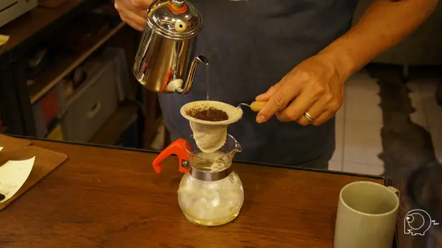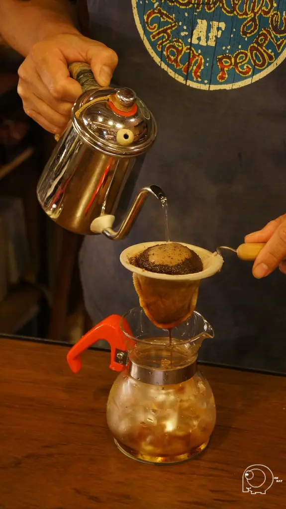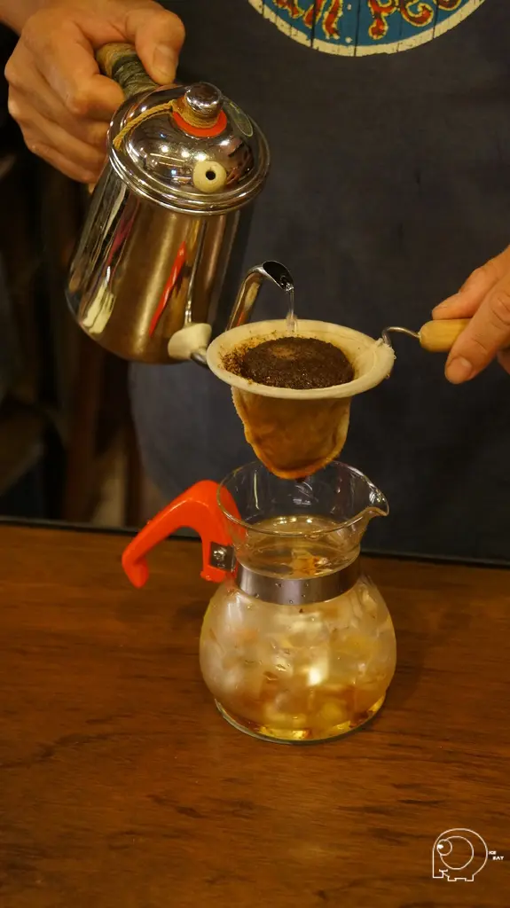 老K點的是冰咖啡,老闆先用很厲害的磨豆機以及電子磅量好重量,拿出法蘭絨布開始沖冰咖啡,因為很少在咖啡廳看到人家用法蘭絨布來泡咖啡,因為法蘭絨的處理方式很麻煩,使用後需要泡水煮沸消毒,如果沒有好好的處理,那咖啡沖出來會有異味...........,基本上就是很麻煩的意思,老闆告訴美姬是要讓冰咖啡喝起來不會澀,所以使用法蘭絨,因為用法蘭絨手沖的咖啡會比使用濾紙保留更多的油脂,所以咖啡會比較不澀. 接下來就看老闆表演囉,先加水讓咖啡膨脹然後悶蒸,之後在加水.......冰咖啡完成.
