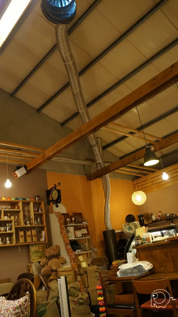 在雨變小之後,打算買包咖啡豆就要離開趕下攤行程,結果因為這咖啡都又跟老闆聊了好一陣子.老闆標榜自己烘培,烘培咖啡豆的機器一定不可少的,這家店特別的是他排放烘培咖啡豆熱氣的裝置,直接連到屋頂,屋頂上的排氣裝置,老闆說因為所有的錢都拿去買設備了,所以屋頂就只簡單處理囉.