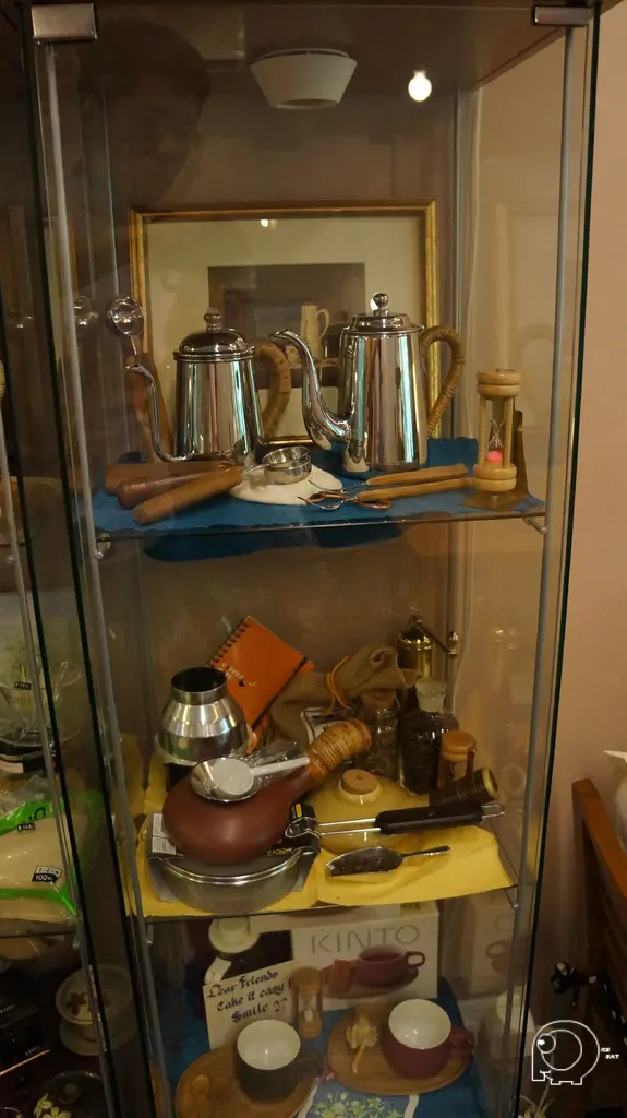 再繼續談論店狗前還是先來點杯咖啡吧!我們到的時候,老闆娘在幫其他客人做輕食,這裡的輕食蛋糕都是老闆娘手作的喔,當時因為擔心禽流感而停售的招牌提拉米蘇,目前又開始販售了喔.因為美姬在趕時間,所以我們聽老闆的簡單版的介紹,聞了一兩支咖啡豆,美姬與老K就點好了,但是後來看到其他客人來的時候,老闆娘會端出一大盤裡面裝了好多藍色小罐子,裡面裝的是不同的豆子,是讓你聞香的用的.這點跟Smith&Hsu很像,方便讓你在一堆茶中選出自己愛的口味,但是咖啡豆聞起來跟喝起不一定是相同的,應該是說常常不相同,呵呵~所以咖啡是不是有趣多了.大家如果想要聞聞咖啡香,記得等老闆娘來才點喔.