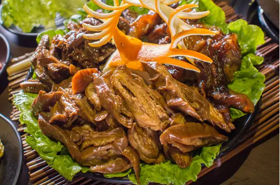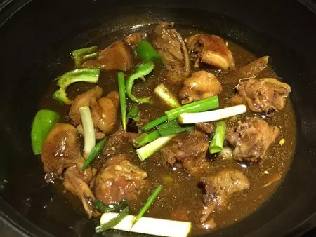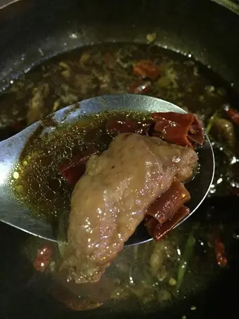花雕雞的雞肉是選用雞腿肉,不是過嫩到爛的雞肉,是很有嚼感的雞肉,雞肉從油亮的醬汁中撈起,散出酒香、薑味。花雕雞是瘋麻辣的主廚待過台北的花雕雞名店-一品花雕雞的第一代廚師,對花雕雞料理拿手,將它帶入麻辣火鍋店。
