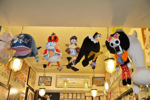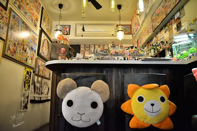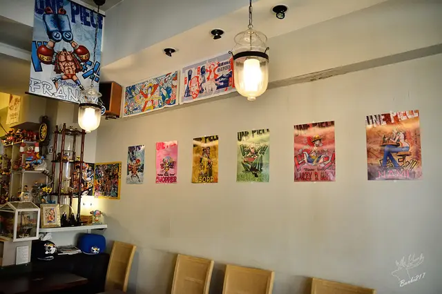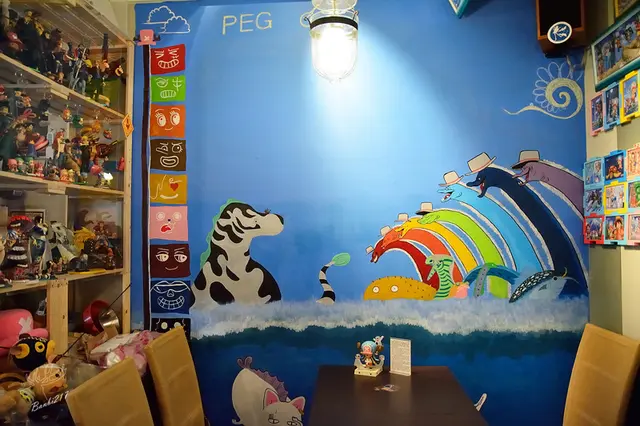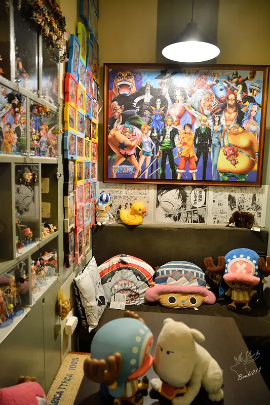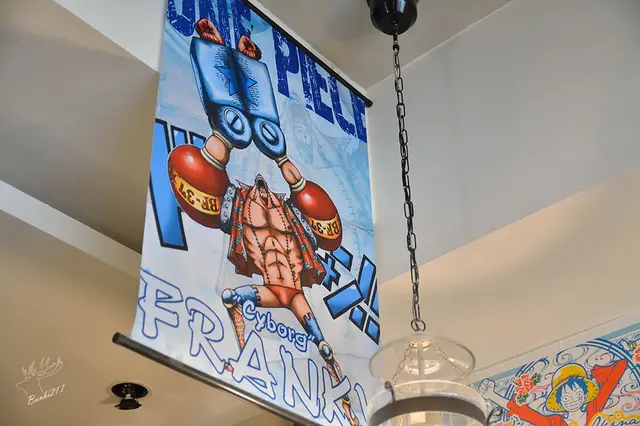 我喜歡這面牆,有航海王的海王類七彩韌魚兄弟、大象鮪魚、海貓、海牛(被桌子擋到了),左邊的旗幟有喬巴的帽子,以及魯夫、索隆、納美、騙人布、香吉士、佛朗基、布魯克。