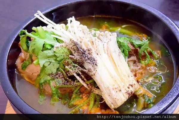 拍完照後,要快速打金針菇、山茼蒿壓到湯中悶熟