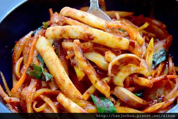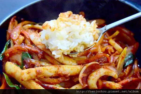 如果你是個愛吃辣的人,或許會喜歡東輝的辣魷魚拌飯,我們可一點都吃不消啊...