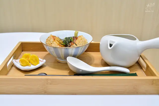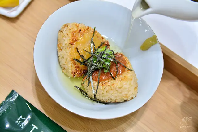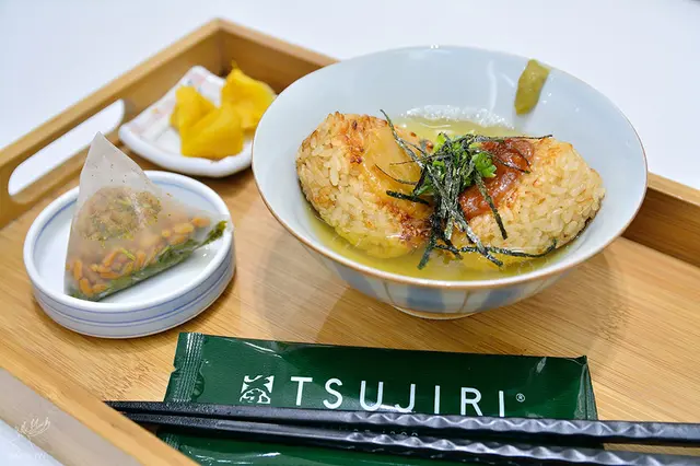 茶泡飯是使用烤飯糰搭配福岡八女綠茶玄米茶、日本漬蘿蔔。(一旁的山葵芥末是喜好加入)