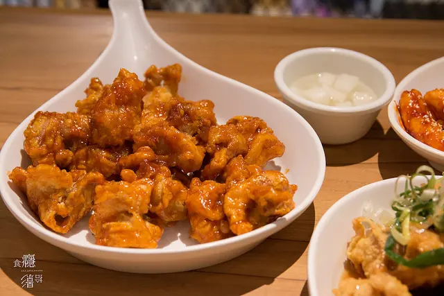 淋上醬汁的炸雞吃起來口感稍黏膩,味道上則偏重,所以在吃這道時,我偏好搭配腌蘿蔔跟燒酒,才能平衡口味。