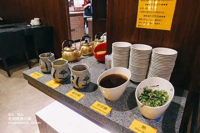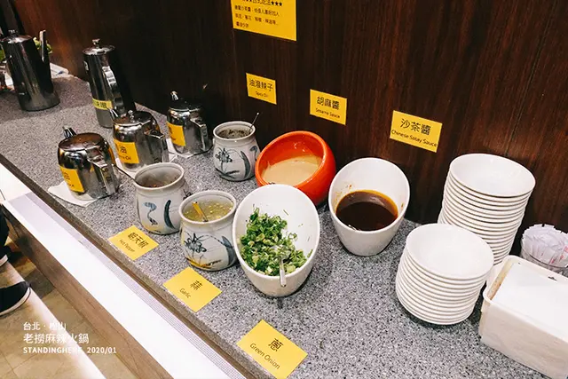 提供了沙茶醬、胡麻醬、油潑辣子、朝天椒、蔥蒜、香油醬油等等...
