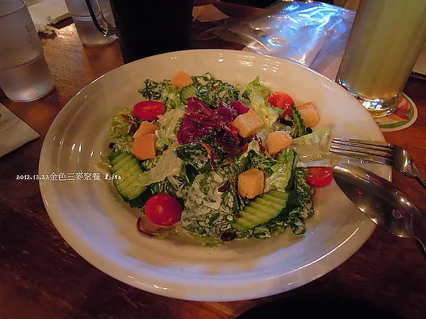 無菜不歡的我鼓吹了大家點了沙拉,端上桌的時候好大一盤,裡面有超多種菜的,依據官網的介紹裡頭有:蘿蔓心、麵包丁、葡萄乾、小番茄、小黃瓜、培根絲、紅包心菜用凱薩醬拌勻,最後灑上帕爾梅桑乳酪。
