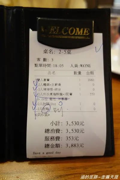 結帳三個人加10%服務費後總共是$3883,一個人約$1300。