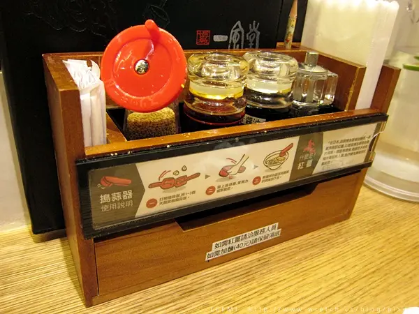 座位有擺一些基本調味料,今天都沒碰到,有點煎餃才用得上。給重口味朋友的蒜頭與擠蒜器,不過今天這蒜頭感覺沒什麼味,作用不大。供應的是冰開水,水壺在桌上自助取用。一風堂開業也不過一年左右,吧台的桌面已經有很明顯的磨損。