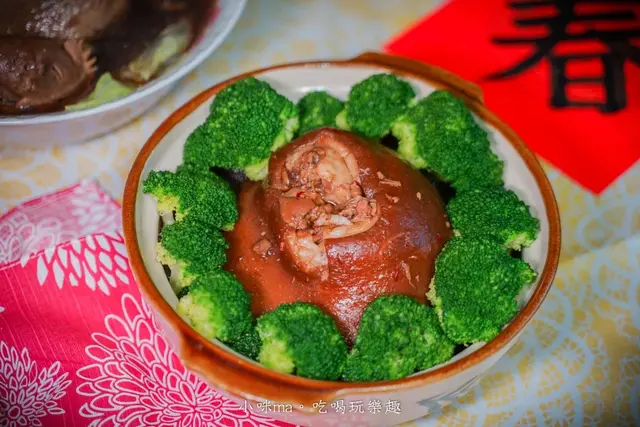 大過年的怎麼可以少了富貴蹄膀,俗語說吃腿庫補財庫,年夜飯當然少不了這一味,選用台灣本土豬腳搭配中藥材、紅麴下去細火慢燉,少了原本蹄膀的油膩感,覆熱方式更是簡單,只要擺進電鍋加熱就OK,一旁用翠綠的花椰菜陪襯,兼具美味與健康