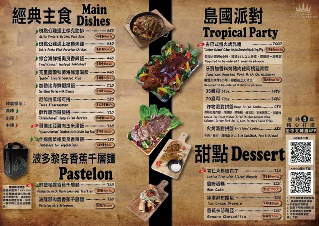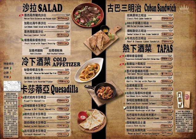 全天候供應的單點品項有沙拉、冷下酒菜、卡莎蒂亞、古巴三明治、熱下酒菜、湯品、加勒比海湯品、海島風燉肉、美味炸物、經典主食、波多黎各香蕉千層麵、島國派對、甜點等多種豐富拉丁美洲的多國料理,沒有出國,就來這享受一趟美世界之旅!