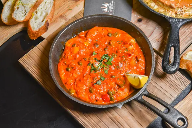 辣味番茄燉蝦據說是以前古巴殖民時期在甘蔗田裡工作的海地奴隸所研發而來,這道的醬汁較為濃稠,是以濃湯料理方式來製作,但基本上都會使用辣椒來提升風味,搭配的主食以海鮮食材為主軸,以葡萄酒、番茄醬、酸豆、白酒醋為基底的燉蝦,風味濃郁厚實有著微酸的口感。