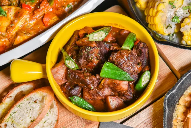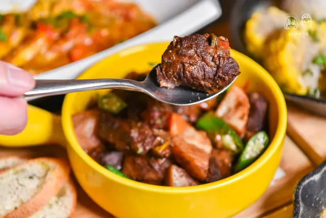 除了牛肉塊,裡頭還有燉煮至入味的馬鈴薯及紅蘿蔔與秋葵,搭配法國麵包相當有飽足感。