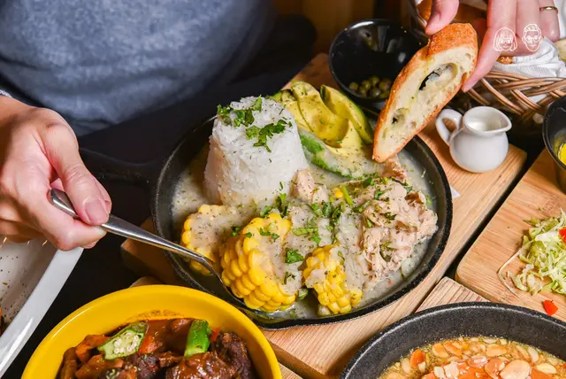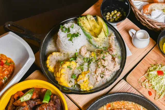 為哥倫比亞家常菜的湯飯以雞高湯為基礎,搭配了手撕雞胸肉、玉米、馬鈴薯和酪梨等蔬菜,底層的雞湯口感濃稠,品嚐的到雞湯的清香甘甜及馬鈴薯的香氣,讓人每吃一口都相當享受這溫潤的迷人風味,加上異國的香料讓湯飯的香氣更為豐富。