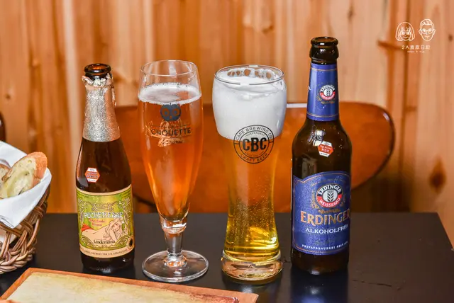 左邊的水蜜桃啤酒的酒精僅2.5%,此款有著水蜜桃的清香和淡淡的甜味,適合不太常喝酒的女生,而艾丁格小麥能量飲品則是無酒精的飲品,雖然是無酒精,但小麥的香氣卻比水蜜桃還要濃郁,也更像啤酒,因此非常適合想喝酒,但因為開車不能喝酒的人唷!