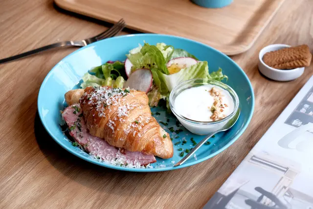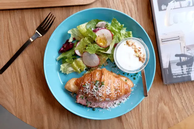 圓盤上份量不多的簡單生菜搭配,再淋上酸酸甜甜橄欖油醋醬汁,灑上現磨起司和蝦夷蔥的酥脆口感可頌裡,