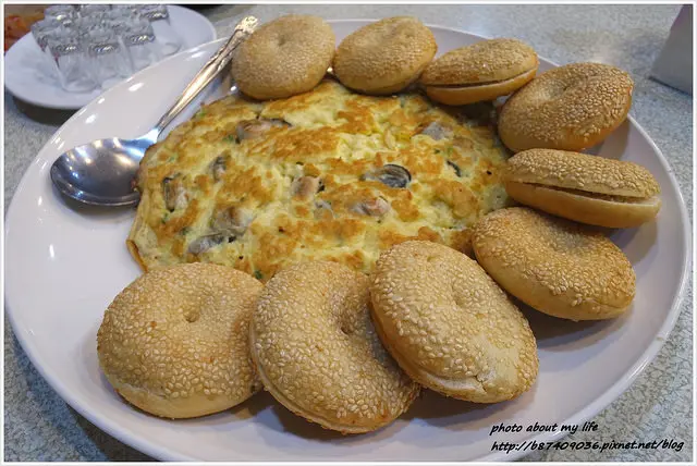繼光餅說是馬祖漢堡但越嚼越帶勁的紮實口感更像貝果 咬久覺得有點乾還好有蚵蛋的油脂稍稍潤口