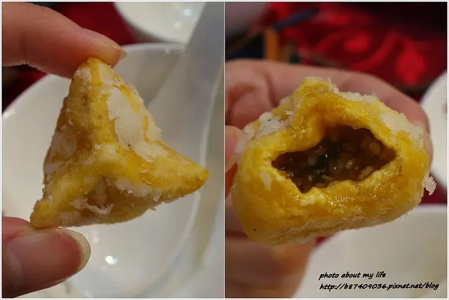 外皮因為摻進地瓜所以呈現金黃色 內餡是滿滿花生芝麻粒的香滑甜醬 趁熱咬下外酥內稠 好吃