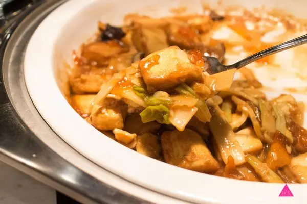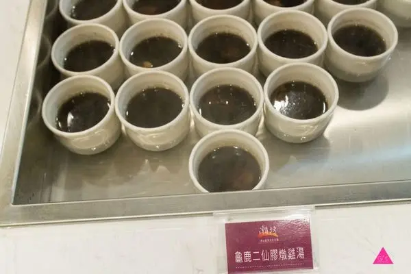 龜鹿二仙膠燉雞湯是人氣菜色,天然藥材熬煮黑色雞湯清甜阿捕,雞肉經高壓燉煮軟而不爛