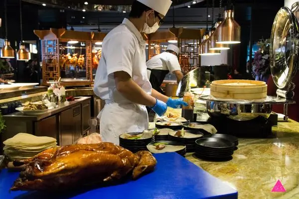 現烤現切廣式片皮鴨是潮坊吃到飽的一大特點!