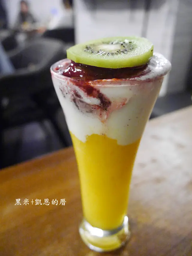 很漂亮的漸層色,下方是百香果冰沙,鋪上莓果果醬與鮮奶油