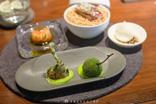 前菜有四道小菜分別為干邑蔬菜螯蝦軟凍、煙燻背脂沙丁千層魚醬、Persillade女王腿、勃根地田螺,Persillade女王腿就是田雞腿,吃起來肉質很軟嫩,調味也很精緻,再來是勃根地田螺是用整個包覆的作法,吃起來也很特別,干邑蔬菜螯蝦軟凍光是看就覺得很精緻好吃,煙燻背脂沙丁千層魚醬是我蠻喜歡的,很像是在西班牙吃伊比利火腿感。
