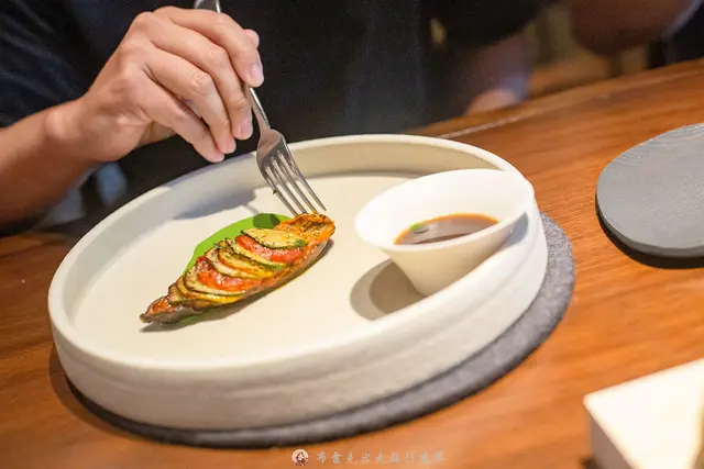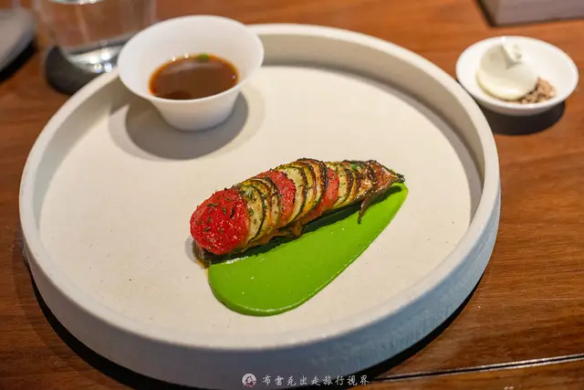 一看到這道菜就會讓人想起料理鼠王,Ratatouille真的是一道很經點的法菜,一層一層蔬食疊加看起來就很療癒,旁邊的佐醬相當也是相當的不錯,然後旁邊還有一碗是用蔬菜煉下來的高湯,很像是煎牛排Gravy醬的感覺,喝起來帶有一點苦鹹,還不錯喝,我個人喜歡啦!但朋友覺得還好。
