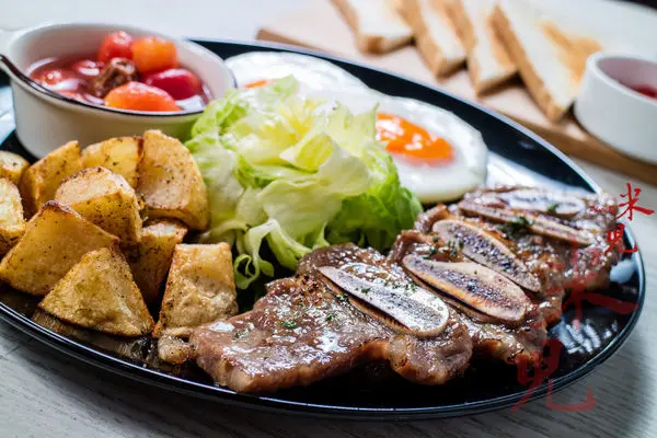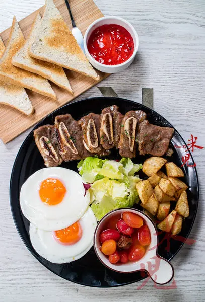 韓式牛小排早餐,450大洋,真是很RICH的韓式早餐啊!這牛小排是用韓國醃醬加上水梨、蘋果去醃的,所以非常軟嫩,幾乎吃不到牛肉味(這點對米兒來說比較不合口味,我喜歡牛肉要有該有的肉味啊~~),但帶甜味的烤牛小排,據說很受愛肉一族的歡迎。配菜也很豐富,有沙拉、薯塊、太陽但和漬番茄,再加上烤吐司,吃下來會非~~~常飽~~~