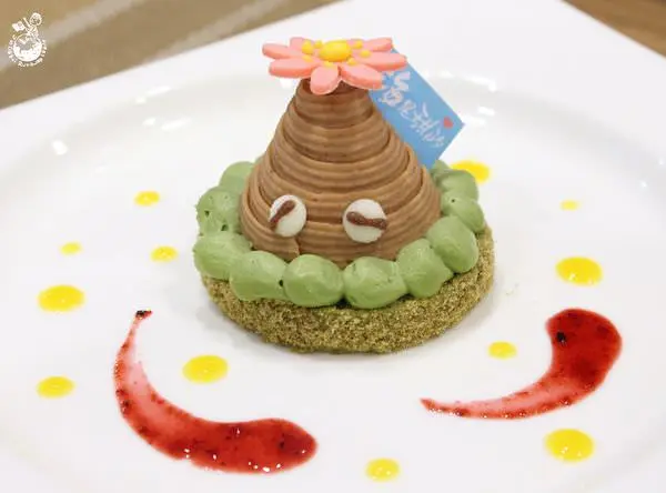 寄居蟹是八月份誕生的,模樣討喜,以鹿兒島抹茶蛋糕搭上抹茶奶醬為基底,上面是栗子慕斯包覆香草慕斯與香橙布蕾,很適合偏愛清爽口感的人