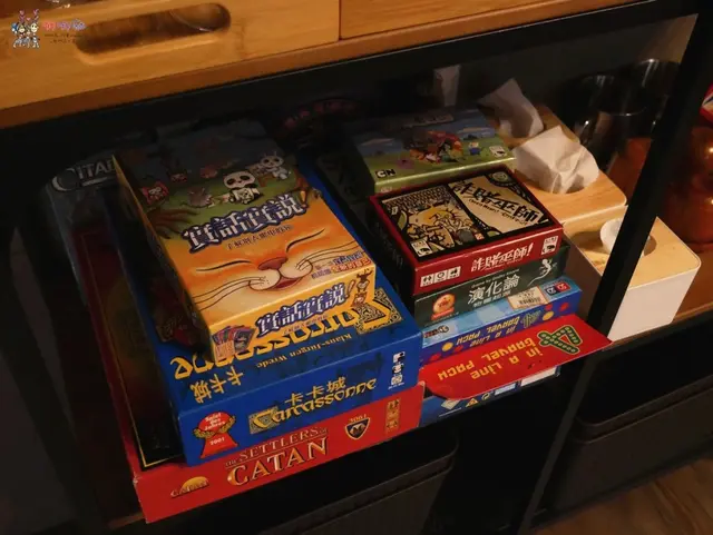 水和餐盤那些都在架子上讓客人自行拿取,無聊的話也可以玩一玩桌遊。