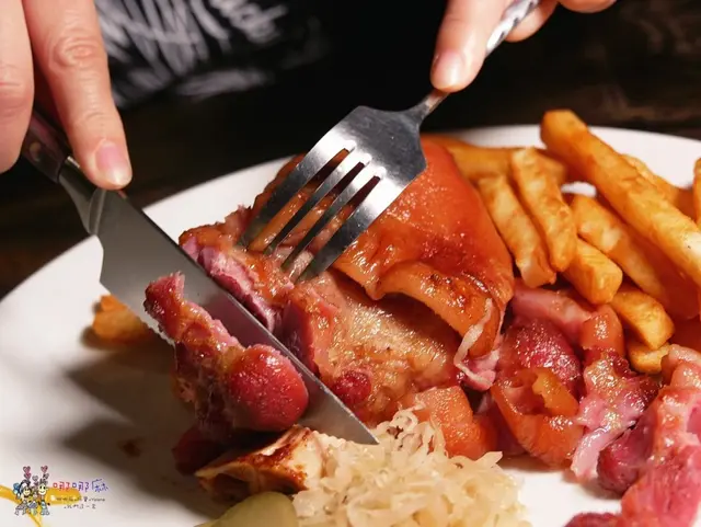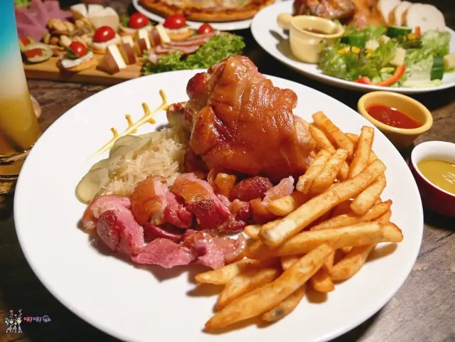 主菜我們點了一個德國豬腳,這個豬腳要事先預訂才有,因為他們是用生豬腳下去烤的,包含事先的準備,從生的到端上桌,半天的時間就過去了,臨時來店家是沒辦法變出來給你的喔!