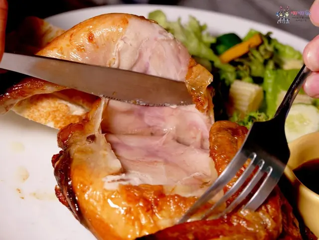 一切開,果然是不負眾望的流出湯汁來,而且那個雞皮也被烤的薄脆生香,光是在這邊打字我的肚子又餓了,口水都快滴下來。