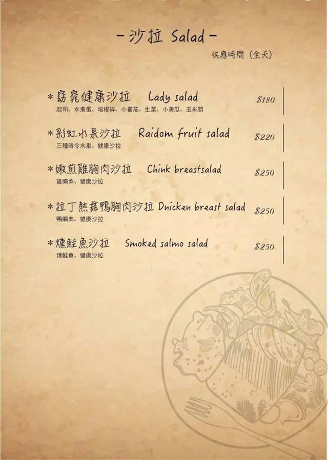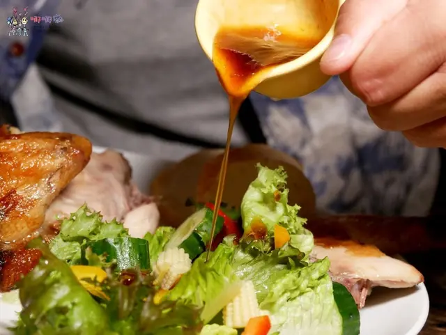 不過旁邊很煞風景的是放了一堆我不愛的生菜,雖然看上去他很翠綠好像很清脆並且感覺很健康,好吧!還是交給阿寶,他是生菜的擁護者。在吃之前別忘了倒上店家特製的油醋醬,吃起來會比較香。