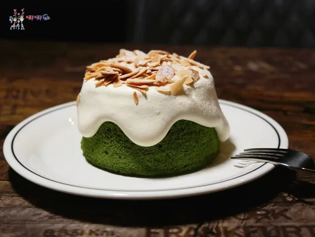 最後的甜點店家端出抹茶戚風蛋糕,不用多說,在綠綠的戚風蛋糕上面淋上鮮奶油的畫面太吸引人了。