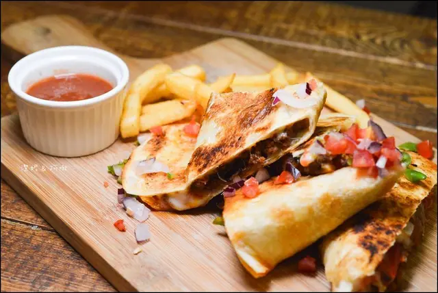 必須說這道也是我非常喜歡的一道 現煎的墨西哥酥餅,口感軟嫩,裡頭包了香濃夠味的辣味牛肉、起司、蔬菜以及墨西哥辣椒,超美味的啊!口感非常豐富。旁邊附著的是酸辣的莎莎醬,如果口味想要再重一點,可以沾著莎莎醬一起吃;薯條也很讓人驚豔,像我們拍照拍到食物都冷了,當然薯條也不例外,可是吃起來依舊香脆