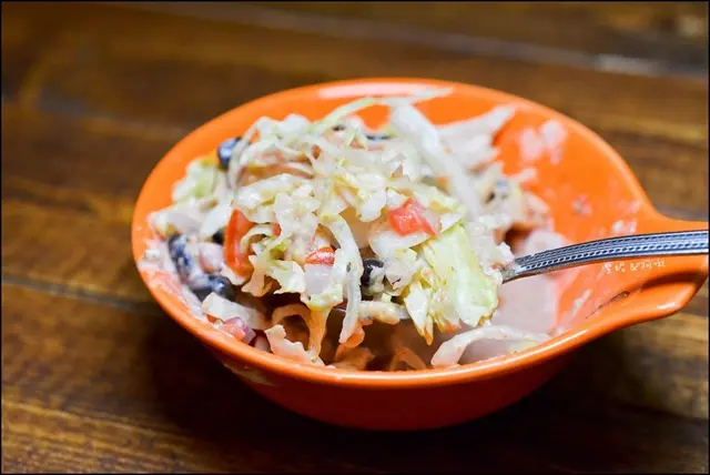 這是法士達沙拉,將碗裡的食材全部攪拌均勻即可,包進餅皮裡能帶來清脆且清爽的口感