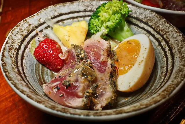 兩大塊稍稍炙燒過的鮪魚,搭配日式胡麻醬汁,還有半熟蛋與草莓,非常特別又爽口