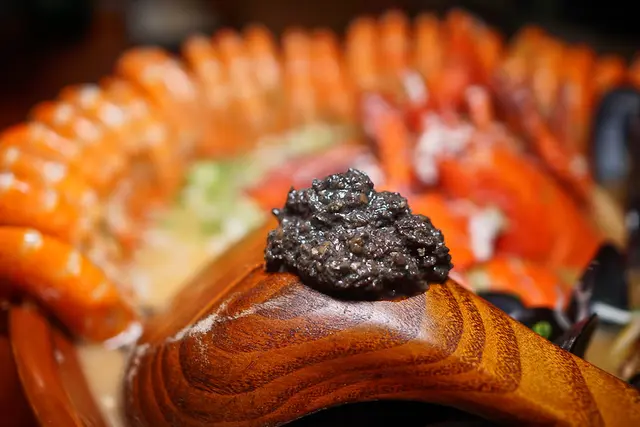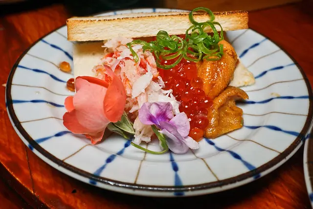 嚴格說起來,以我這種胃量在這時已經是吃不太下了,但上來了超棒的美食,怎能不吃。用烤到酥脆的吐司包著滿滿海膽,鮭魚卵、松葉蟹肉。一口咬下,真是超澎湃又奢侈