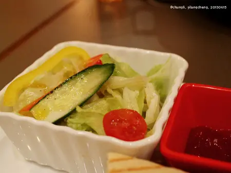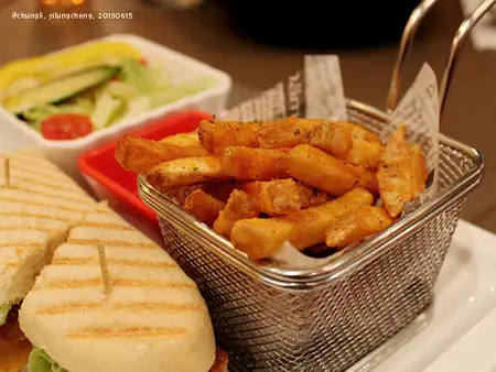 附餐有沙拉和薯條:沙拉用得是橙汁醬料, 吃起來清爽開胃;薯條也炸得挺好, 外酥脆內軟嫩, 稍為油膩了些, 建議趁熱食用。不過我很喜歡那個放薯條的金屬籃子和印了英文的油紙, 感覺好有質感!