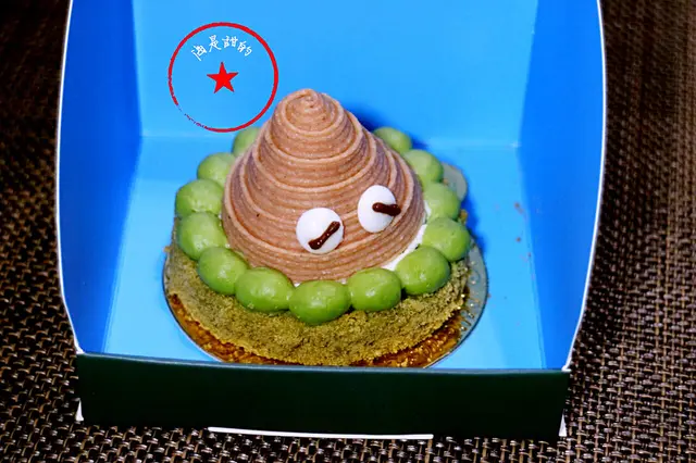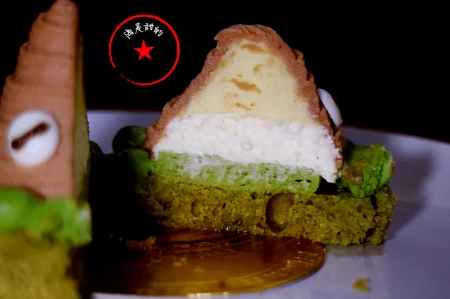 基底以靜岡抹茶蛋糕和抹茶奶醬為主,上層的外圍是栗子慕斯