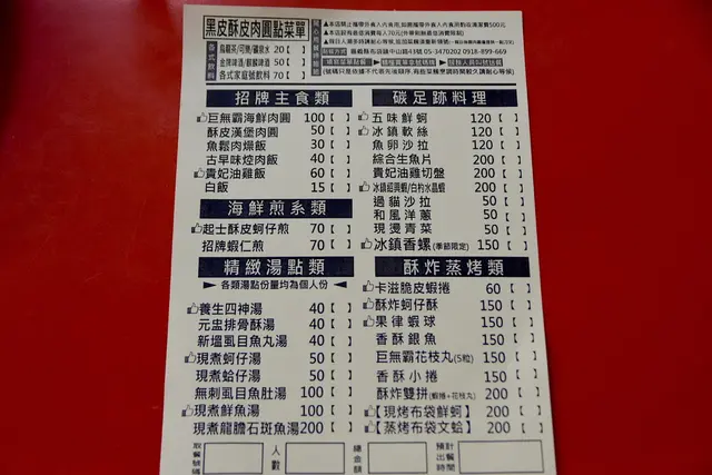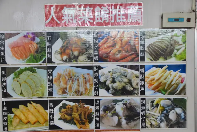 店家鄰近布袋觀光漁市中山路上,店門口掛著紅色大大菜單供客人參考,觀看這菜單整體菜色定價很親民。