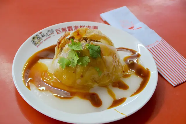 這是店家號稱D罩杯巨無霸海鮮肉圓,表面淋上自己調配醬汁來提味。