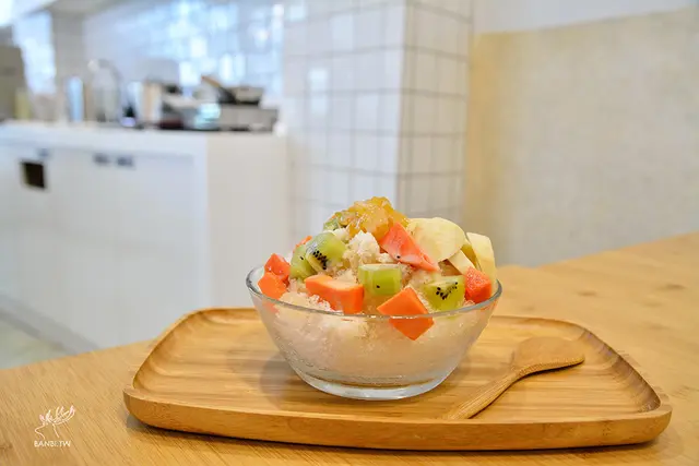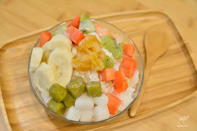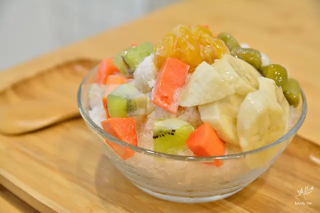 其實送上來時我感到有點失落,因為本來我在小時侯麵茶冰($50)、夢露剉冰(自選五種料$70)猶豫不決,後來是看了承億小鎮慢讀FB相簿的照片被滿滿的水果吸引才點選綜合水果冰,但送上來後發現水果未能和他們拍攝的照片那樣豐富,水果上也少了兩種,若是少了加價的白玉,想必看起來會更少。