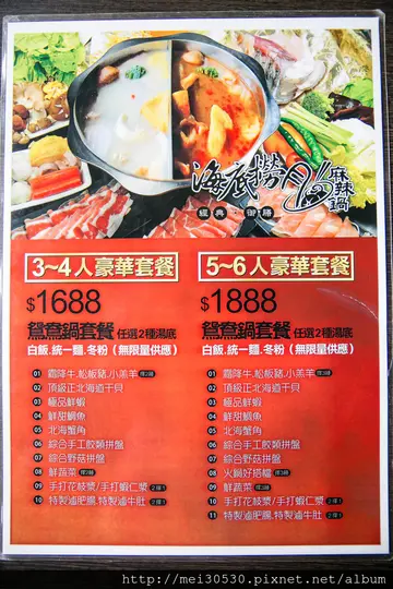 小柔今天要介紹彰化北斗的美食,不是肉圓!!!! 而是麻辣鍋喜歡吃鍋,吃遍大江南北的鍋,北斗這間麻辣鍋湯頭著實讓小柔有點驚艷!!(°ο°)~ @ 這家位在北斗中山路上的麥當勞斜對面,海底撈月麻辣鍋/鴛鴦鍋店門口還有畫停車格,非常貼心啊! >///< 門口還有寫上各種鍋底的價格,光湯底就有至少8種可以選擇了!價格在小柔看來.....比台北親民好多啊QAQ知名的麻辣鍋店,光湯底就要 $NT.1200元了!!!≡(▔﹏▔)≡在網路上這家評價並不多,所以小柔決定一探究竟!!!??? 海底撈月,店內裝潢得古色古香 優雅又帶點復古,座位很多,很適合聚餐唷!<( ̄︶ ̄)> 坐了下來,店家便親切的來招呼點餐 當天我們是四大兩小用餐,所以我們選了3~4人豪華套餐 $NT.1688元鴛鴦鍋套餐,湯底可任選兩種~( ̄▽ ̄)~*白飯、統一麵、冬粉,都是無限量供應唷!請店家推薦,我們點了經典麻辣鍋跟龍骨奶香鍋麻辣鍋,是豬大骨+獨家秘方熬煮10小時而成龍骨鍋,是豬脊椎熬煮8個小時+牛奶 ,所以有滿滿的鈣唷! >w<整條豬脊椎都叫「龍骨」,脊椎越靠近頭部越大塊,越靠近尾巴越小 剛好我們有搭上店家的母親節特惠活動~*與媽媽同行贈霜降牛肉一盤 *來店打卡贈火鍋好搭檔一盤 火鍋店還堤供自己煮的麥香紅茶,非常好喝.......>w<也是無限量供應唷! 自助醬料區,各式醬料非常齊全比較特別的是:有腐乳醬@O@ ....所以小柔也弄來嚐嚐ㄟ( ̄▽ ̄ㄟ) 店家上菜速度蠻快的!屁股還沒坐熱,湯底就先上桌囉! 麻辣鍋,我們點小辣! 辣度小柔覺得還OK! 湯頭順口,讓人想一吃再吃>///< 好喜歡這一味~~龍骨牛奶鍋,非常香甜,滿滿的鈣質在裡面,小孩很喜歡喝唷!~( ̄▽ ̄)~*推薦! 喜歡吃鴨血的朋友,一定不能錯過!麻辣鴨血煮得非常入味>///< 細孔完全都吸飽了麻辣湯汁!!! 好吃唷~忍不住又再點了一盤鴨血<( ̄︶ ̄)/ 附餐白飯、冬粉、統一麵 也上來囉!特製滷肥腸大腸頭店家有特別滷過,可以直接食用,也可放進麻辣鍋裡滾一下就起鍋吃起來帶著濃厚的香氣,Q彈度剛剛好! 也蠻喜歡的啊!>///< 圖下~上層為霜降牛,下層為小羔羊 羊肉片,沾上腐乳醬 好對味啊! ( ̄︶ ̄)> 海鮮類上桌~ㄟ( ̄▽ ̄ㄟ)頂級正北海道干貝、鮮甜鯛魚、北海蟹角、手工花枝漿 雖然是冷凍....但~海鮮好新鮮啊!! >w< 極品鮮蝦值得一提的是這蝦子!!!!看起來不怎麼樣??? 但卻是店家特選的極速冷凍蝦吃起來非常鮮甜!!!! 好讚!!!>w< 讓我有在海產店的錯覺XD可以媲美活跳跳蝦子現煮般的美味~ 綜合手工餃類拼盤餃子類也不賴喔!!<( ̄︶ ̄)/*來店打卡贈火鍋好搭檔一盤 火鍋料都蠻優質的!!! 吃起來料多又實在( ̄︶ ̄)> 高麗菜、娃娃菜綜合野菇拼盤 把喜歡的料,都丟進鴛鴦火鍋裡面煮覺得好幸福唷!!! 尤其夏天吃麻辣鍋還有冷氣吹QwQ整個就是爽快啊!!!!ㄟ( ̄▽ ̄ㄟ)冬粉跟統一麵,丟進麻辣鍋,或是龍骨牛奶鍋都好讚唷!!!>w<麵條把湯的精華吸得飽飽的!!!!! wow....好想再吃QAQ(現在半夜寫文好煎熬啊XDDD)麻辣鍋我好愛!! ~( ̄▽ ̄)~* 龍骨牛奶鍋+統一麵,小孩好喜歡!一連加點了三次統一麵(無限量供應) 顆顆≧▽≦y 4大2小吃 $NT.1688元鴛鴦鍋套餐其實蠻飽的....到最後都硬吃XDDD …查看更多