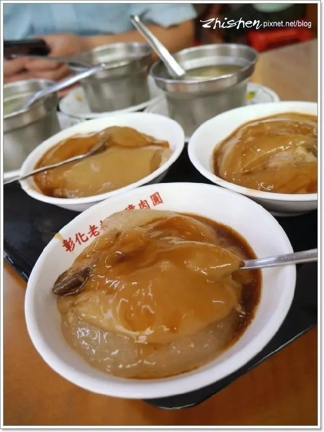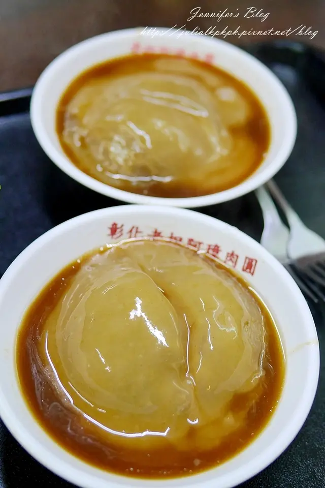 吃完"阿泉焢肉飯"後覺得有點小空虛,另外也覺得既然到彰化了,沒吃到肉圓怎可打道回府?雖然老爺不愛吃肉圓,但amy印象中沒在彰化吃過道地的,於是吵著非吃吃看才行。也不知道哪一家好吃,只好打開google map,挑近的吃。 這家『阿彰肉圓』離"阿泉焢肉飯"不遠,其實這一帶很多家肉圓店,但因沒來過也不知道要挑哪一家,只好看哪家人多吃哪家囉~。 『阿彰肉圓』不只人多店面大,還是"那天年我們一起追的女孩"的拍攝地點,衝著這噱頭再加上國慶肉圓的大名,難怪觀光客很多。 炸鍋裡滿滿的肉圓。 『阿彰肉圓』有兩個用餐區,以肉圓店來說,環境真的挺好的,有冷氣,且還蠻乾淨的。 肉圓很大一個,算是皮厚肉多,味道還可以,雖沒有驚豔,但也不難吃,只是吃到一半時一直在想到底少了什麼味道?後來才在別桌發現了香菜,馬上加進來,果然增色不少呢~。 筍子湯 還可以,筍子的酸香味很濃郁,算是清爽的湯,配上有點油的肉圓剛剛好。 『阿彰肉圓』的肉圓好不好吃,坦白講amy說不上來,因為大概有5年以上沒吃過肉圓了,上一次吃是什麼時候完全沒有印象,所以沒有記憶中的味道可以比較。不知道現在肉圓是不是都這樣?amy純粹只是想回味一下肉圓的味道,況且人到彰化了,說什麼也要吃一下肉圓才行,總之就是吃過就好了。…查看更多