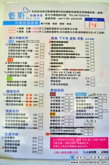 走跳在彰化美食中,認識了一位憨人,經營著藍廚義式廚房,有點不起眼的小店,卻是彰化唯一Barilla認證的義式餐廳。一路看著他認真的傻勁,四處取經,甚至遠到義大利修業,為的就是想讓家鄉的饕友,有更多異國美食的選擇。新一季的菜單設計,意外的親民平價,不管是風味義大利麵還是燉飯,都有令人驚艷的感受!大部分的餐飲業都會選擇車流人潮豐沛的大馬路上,【藍廚義式廚房】,卻反其道而行,悄悄的躲在彰師附工周邊的住宅區巷弄。沒有識途老馬帶路,一時之間還真的挺難發現它的存在。從外觀來說,完全沒有華麗的裝潢,簡簡單單,卻是很有溫度感。在經過幾次整理後,一樓的風格帶有樸實的鄉村風,吧檯前方的座位不多,但彼此間距算寬敞舒適。若真要挑毛病,就是桌椅款式比較陽春,如果改日可以稍做更換,應該會提升質感。牆邊擺上了老闆前往義大利修業的點點滴滴,不只是廚藝上有極大的收穫,對於食物的熱情,更是越加濃烈。另一側的樸實牆面,以乾燥花藝作為裝飾,讓原本單調的頹廢感,多了不同的風貌。二樓的空間就顯得較為開闊,在布置上色系對比鮮明,很有歡樂時尚氣息。印象中之前還會有彰師大的學生固定時間來駐唱,現在好像沒有了,有點小可惜。整個樓層也很適合團體聚餐或舉辦派對活動,有相關的需求可以向店家預約。【藍廚義式廚房】在老闆剛從義大利交流廚藝歸國後,曾推出新的菜單,當時的料理精緻度很不錯,但總覺得價位上令人卻步。經過多方建議,在順應民情下,10月底推出的新菜單,不僅菜色有所增豔,價格上更是很有誠意,只要百來元,道地的義大利美食就能呈現眼前。義大利麵、焗烤、燉飯與披薩,隨餐會附上蘋果醋飲,若想吃得更澎湃,可以加價升級套餐。60元加購,有濃湯與麵包;100元加購,除了湯與麵包,更多了開胃小品與甜點,很划算。加購羅馬套餐 100元/份因為阿貓近日抱病在身,食量受影響,這回與阿娜答來用餐,除了點用兩份主餐外,另外只加購一份升級套餐,想吃又怕吃不完的折衷選擇。爐烤麵包來自凱福登知名窯烤麵包,沾取附上的初榨橄欖油,麵包令人玩味的Q勁,緩緩透出樸實卻動人的麥香,交融著橄欖油的清新芬芳,簡單組合卻美味。開胃小品別小看這一小串毫不起眼的開胃品,上頭的葡萄與小番茄,都是在地小農的心血。經過【藍廚義式廚房】長時烘烤,將精華濃縮。搭配上馬芝瑞拉起司,爆發而出的水果香與甜,在濃郁的奶香加持下,更是迷人!今日濃湯阿貓先前對南瓜製品唯恐避之不及,但【藍廚義式廚房】的好味道可真讓我念念不忘。由於多放入了馬鈴薯泥這個秘密武器,南瓜濃湯不只香濃,停留在口腔品味時,還會有一種沙沙的特殊顆粒口感,兩者的甘美齊放,令人回味無窮。南義鄉村豬肋排燉飯 250元/份瑰麗又霸氣的燉飯一上桌,不禁暗自驚呼。金黃亮眼的米飯,頂著兩支個頭不小的豬肋排,在其他地方要吃到這種料理,通常荷包會小失血,【藍廚義式廚房】卻是300元有找。在義式香料的襯托下,以燒烤調理逼出豬肋排的油脂與香氣,火候控制要很謹慎,才能完美保持豬肋的最佳口感。原本想紳士的用刀叉取用,無奈手拙又禁不住氣味的引誘,只好棄械投降,直接徒手拿取啃食。豬肋很鮮嫩,每一口都肉汁醇厚,香料的清香帶出豬肉原本的美味,不會搶拍,吮指無窮的樂趣,在此上演。美麗的燉飯,不只是花瓶角色,經過特殊料理的手續,【藍廚義式廚房】的燉飯入口不會生硬,是進口義大利米與台梗9號攜手演出,蓬鬆感又帶咬勁。米粒中深深地滲入鬱金香香氛與濃郁醬汁,口口回甘生香,好吃沒話說。北義牛肝菌什錦寬麵 200元/份上回用餐看到鄰桌的料理有被吸引到,順道點一份來嘗嘗。蔬菜的種類與配色都很吸睛,分量一點都不手軟,滿滿蓋住整盤麵,是全素者的最愛。主角是來自義大利的牛肝菌,伴著新鮮的四季豆,大白菜、彩椒、玉米筍、茄子、青花菜,整齊有秩序的環列,十足精彩。寬麵牢牢實實吸附著濃濃的奶油醬汁,麵體Q軟,牛肝菌的蕈香在嘴裡纏綿難捨,又有多種在地的小農耕植的鮮蔬共舞,結合台灣人情的義國美食,激盪出不同的美味文化。阿貓習慣餐後才會享用飲品,所以有特別請店家延後製作,如果沒有事先強調,飲料有時會比料理先端上桌。奶酪有數種甜點不定期更換,之前吃過提拉米蘇與香漬蘋果,今天是奶酪。滑順綿口的奶酪,在口腔溫度的催化下,化作一股清香奶味。蘋果醋飲無論是佐餐或是餐後飲用,酸甜清爽的蘋果醋,總是帶來無比的舒暢感。拿鐵 90元/杯 (附餐飲料可折抵20元更換)咖啡豆來自員林知名咖啡店,右舍,加入鮮奶調和成的拿鐵,咖啡香柔順口,不酸不苦,尾韻回甘。晚餐結束後,店內用餐人潮緩緩散去,運氣好還可以看見店貓酷奇在店內巡視,不怕生的貓店長,可以近距離接觸。另外還有新朋友豹哥,出身名貴,但長相有點憨萌,反差很大。誰說彰化只有傳統小吃,只要有心,即使不是一線城市,也可以有精緻水準的演出。【藍廚義式廚房】一路跌跌撞撞,滿載對家鄉的熱忱,致力推廣彰化的美食新風貌。結合在地物產,讓義大利的異國美味飄香,不再高不可攀,平價用心的好料理,推薦給各位。…查看更多