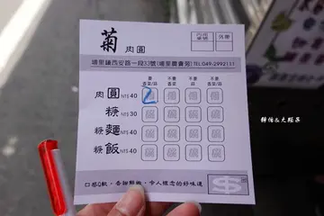 南投埔里有很多肉圓店家,每次要到清境農場都會先來埔里覓食,抵達當地隨意搜尋到的【菊肉圓】,沒想到是埔里排隊肉圓店家,生意超好,上午十一點半營業,我們下午大約兩點半抵達就剩最後兩顆,再晚一步就吃不到了!大家到埔里都吃哪家肉圓呢!?之前我們都吃施家肉圓,這回吃的【菊肉圓】也很不錯,皮Q餡多,還有免費的湯可以加!【菊肉圓】就位於埔里農會展示中心旁,埔里農會展示中心內有販售好吃的美人腿泡麵,可以買一下!可別想說怎麼沒有甚麼人,這是因為最後兩顆肉圓已經被我們包了,賣不到三小時,肉圓已經賣光光了!點餐方式比較特別,要先跟櫃台登記點餐,然後等店員叫號碼入座!【菊肉圓】菜單及價格賣的東西很簡單,除了肉圓之外,就是肉羹了,不過店內另有販賣草仔粿、芋粿糕及客家麻糬等,我們登記了最後兩顆肉圓後,店家也放上"肉圓已售完"牌子告知客人在油鍋內的肉圓每一顆都是有主人的了,覺得油鍋內一顆顆的肉圓畫面好療癒!肉圓 $40就是這碗肉圓讓大家排隊等待也甘願!肉圓從油鍋內撈起後,剪開淋上一白一黑兩種醬料,再放上香菜,看似簡單卻是迷人好滋味,若是不加香菜或蒜,菜單上記得劃對格子唷!肉圓內有很多的筍塊及肉塊,醬料算是比較清淡,白醬微甜,口味不會太重寫著"我很辣"的辣椒醬,我們則是加另一瓶類似甜辣醬的辣椒醬,感覺肉圓味道比較不會被搶走,太辣就會吃不出肉圓本身的香氣了!肉圓皮很Q軟,肉是大塊一整片的那種,口感濕潤不乾柴送肉圓上桌時還會附上一壺湯,是湯唷,可別誤以為是茶水了,肉圓吃到差不多時就可以加上湯享用,看網路上是不建議吃得那麼乾淨,我們吃的時候不知道,所以吃到只剩下一點點筍塊才加湯,有些人甚至是把肉圓皮吃完就加湯拌著筍塊及肉塊吃喔!羹麵 $40大人吃肉圓,小孩吃羹麵,也是料多味美,羹湯很濃郁,肉羹也有好幾塊最後離開前又買了芋粿糕、草仔粿及麻糬,也都是店家自己做的唷,喜歡客家風味的可以買起來!感覺來埔里就要吃肉圓,因為一開美食APP,就會出現很多的肉圓店家,想吃哪家就看個人囉,生意很好的【菊肉圓】與大家分享!查詢旅遊住宿以上為個人實際造訪後記錄分享,每個人喜好、感受及價值觀不同,僅供參考查看更多