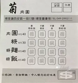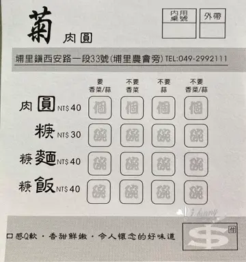 每到一個地方總會搜尋當地美食,發現很多人推薦埔里的肉圓第一站先到了菊肉圓,以前吃的都是蒸肉圓,菊肉圓是油炸的  (❤本文為妹妹食記❤)▲這壺是清湯肉圓吃到差不多時再加進去,別有一番風味 ▲菜單,香菜跟蒜可勾選是否需要添加 ▲菊肉圓大部分星期二公休星期二之外的店休要上FB或官網查詢避免遠道而來撲空 (圖片下載自FB)當天點了兩個肉圓及一碗肉焿 肉圓外皮微Q,內餡的肉塊及筍子份量不少醬汁微甜微鹹,留一點料加上清湯喝還不錯 ▲焿湯味道適中但胡椒味濃油炸肉圓外皮很Q,和蒸肉圓很不同,算是嘗鮮囉。查看更多