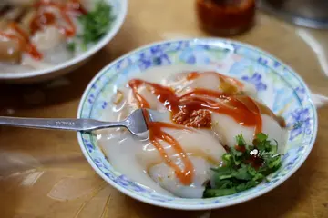 前兩週,阿發受邀到南投埔里演講,心想也十多年沒帶老婆去南投玩,於是要老婆和子女請假一天,一家四口一起順道到南投旅遊。除了原本行程規劃中,到紙教堂和日月潭一遊外,吃、吃、吃當然也是阿發家的一貫風格。而出發前,老婆說若到埔里,一定要品嘗在地兩樣特色小吃!一是鹹油條,二是肉圓。當她對我提出這兩項一定要吃到的時候,我是能理解選鹹油條,但是說要吃肉圓?!原本我還心想說,這是能特別到哪裡去,不過又聽到肉圓竟然可以兩吃!!算阿發吃得、看得都還不夠多,那就非要嚐嚐看不可囉~▲店外觀我們投宿至「永樂園青年旅館」才知道,原來「阿菊肉圓」同是位於西安路一段上,彼此門號相差50號,距離不到200公尺,真是幸運~▲排隊人潮沒想到在週六上午11點多,店家才剛開門營業,店前就已湧現大量前往用餐的人潮。▲用餐環境店內幾乎沒有裝潢修飾,但用餐環境以小吃店家相較,算是相當乾淨明亮。還沒中午12點,人潮就已絡繹不絕,且座無虛席。▲攤上價目表▲美食節目採訪照▲油鍋中的肉圓據店家的說法,每天一定用新的油,而且堅持不使用回鍋油。看得出油鍋中的油很新啊~▲淋上〝雙醬〞原來「阿菊肉圓」的特色不只是肉圓〝兩吃〞,還有另一項好吃的秘密武器〝雙醬〞!!下面再來說這〝雙醬〞有何不同。▲草仔粿與芋粿店家原本只賣肉圓和肉羹,但店老闆夫妻的女兒阿雯,傳承著祖傳古早味的手工做法,做出風味獨特且風評頗佳的各種粿食,並在店內販售。▲點餐單就肉圓與羹類,價位相當銅板價囉。▲每日現包的肉圓店家除強調肉圓是每日手工現做現包外,肉圓皮是由來米漿搭配蕃薯粉混製而成,餡料則是使用豬腿筋肉與筍丁…等調配,加上每天換新油,保證肉圓不僅新鮮,且吃的安全有保障。▲包好的肉圓需先蒸過半晶瑩剔透的模樣。▲草仔粿與芋粿傳承著祖傳手工做法的草仔粿與芋粿,外觀看起來就很具古早味與真材實料。▲草仔粿,內餡很具古早味且鹹香好口感的蘿蔔絲,重點是竟還包著個頭不小的滷肉塊,這真是太合阿發的口味了~▲草仔粿,皮Q好吃喔!▲芋粿口感相當具古早的鹹香美味,同時也是相當真材實料。▲肉圓上桌,還附上一壺茶?!這可不是吃港式飲茶還附上一壺喔!那壺裝的可是〝蔬菜高湯〞。▲肉圓這的肉圓外皮,是由來米漿搭配蕃薯粉混製而成;餡料則是使用豬腿筋肉與筍丁,再加入鹽、胡椒、蔥頭…等調味;最後淋上,由醬油特調而成,充滿古早味的黑色鹹味醬,以及由米漿加二砂糖調製的甜白醬,這〝雙醬〞一淋上,讓Q彈的肉圓皮、鮮嫩的豬肉、清脆爽口的筍丁…嗯,讓原本口感就很不錯,且吃起來不油膩的肉圓,更是顯得鹹甜滑溜順口,完美融合,讓人吃得津津有味。哇!不小心就碗底朝天,忘了這可以〝兩吃〞…還好我們不只點一碗,不然看現場的人潮,若再加點一碗,可能不知要等到何時啊!▲肉圓皮相當Q彈有嚼勁~▲記得留下肉圓餡料不要因為肉圓好吃就不小心吃完了,可要留下內餡,才能吃到在地特色的肉圓不一樣吃法喔!▲倒入高湯在埔里,肉圓有著在地特色獨特的吃法;無論您是外帶還是內用,店家都會附上一壺(袋)用蘿蔔及蔬菜熬煮的清高湯(之前是用大骨,老闆娘說現在人越來越養身,所以後來改成蔬菜清高湯)。所以在這吃肉圓,不要急著全吃完,要留下一些餡料,再倒入清高湯,一碗極為鮮甜美味的〝肉圓湯〞,就輕鬆完成囉。▲肉圓湯很清甜順口的〝肉圓湯〞。▲肉圓肉塊,特寫鮮嫩味美~▲老闆娘向我大推,他們特製的雞心辣椒醬果然是香辣帶勁,風味頗佳,喜辣的朋友可別錯過。▲吃得眉開眼笑…▲肉羹湯外觀清爽不混濁,很像我老婆喜歡喝的客家肉羹湯,且料好實在。▲肉羹湯,湯頭充滿蔬菜鮮甜爽口的滋味~查看更多