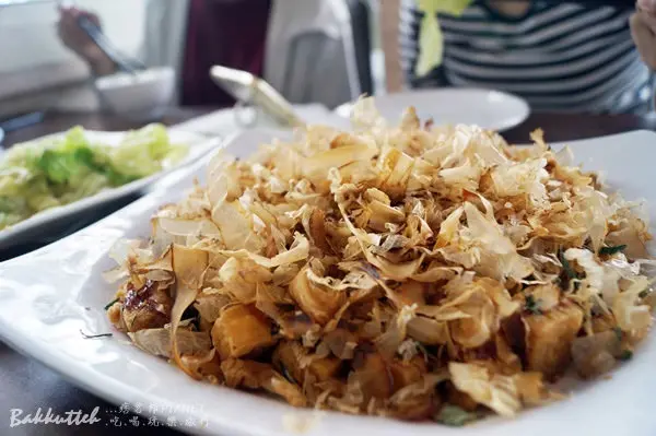 炸豆腐上頭撒上柴魚跟刺蔥,雖然被兩種味道強烈的食材包覆,但是三方互不搶味